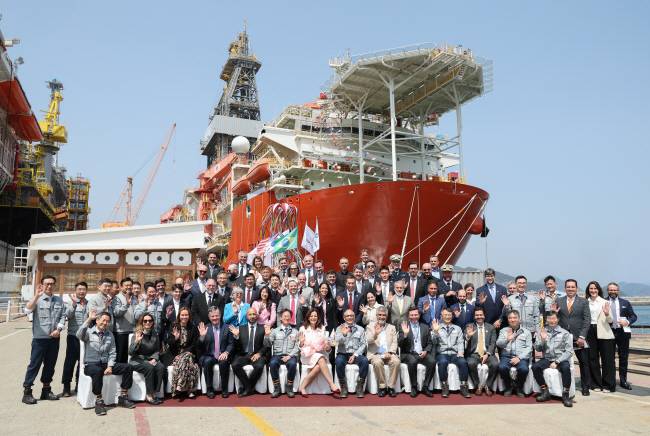 8일 경남 거제 한화오션 거제사업장에서 열린 차세대 드릴십(이동식 원유 시추선) ‘타이달 액션’ 명명식 행사에서 한화오션·한화드릴링·페트로브라스·콘스텔레이션 관계자들이 기념 촬영을 하고 있다. 한화오션이 브라질 국영 석유회사 페트로브라스에 대여하는 타이달 액션은 올해 하반기부터 브라질 해역 시추 작업에 투입될 예정이다.