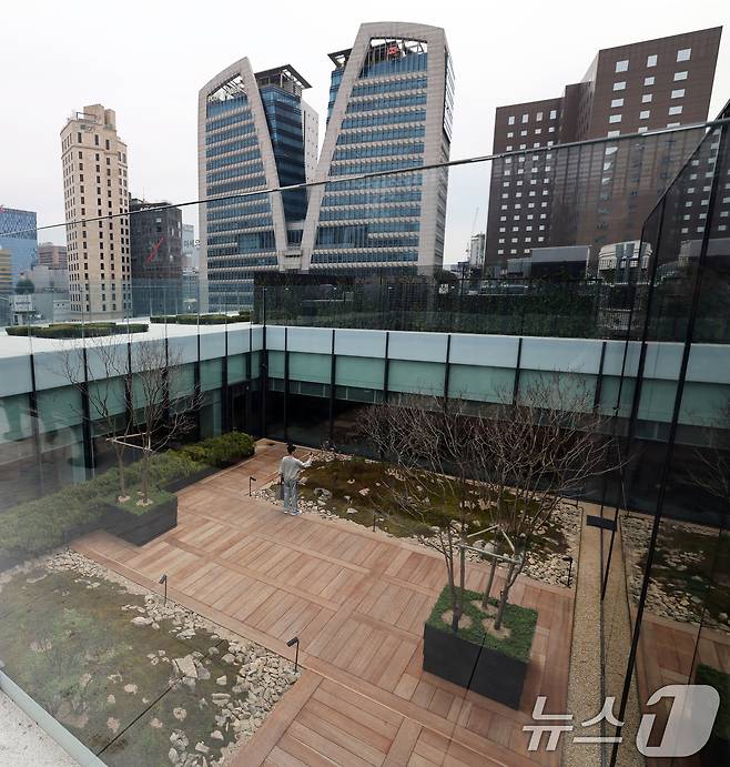 (서울=뉴스1) 오대일 기자 = 신세계백화점이 옛 제일은행 본점을 매입해 10년간 쇼핑과 문화의 복합 공간으로 공들여 단장한 '더 헤리티지'가 9일 개관했다. 더 헤리티지로 새롭게 태어난 옛 제일은행 본점 건물은 지난 1935년 준공돼 1989년 서울시 유형문화유산으로 지정됐다. 한국산 화강석을 사용해 마감한 네오 바로크 양식의 건물로 한국 전쟁 때에도 큰 피해를 입지 않아 준공 당시의 모습을 그대로 보존하고 있다. 사진은 9일 오전 신세계 더 헤리티지 옥상에 조성된 정원. 2025.4.9/뉴스1