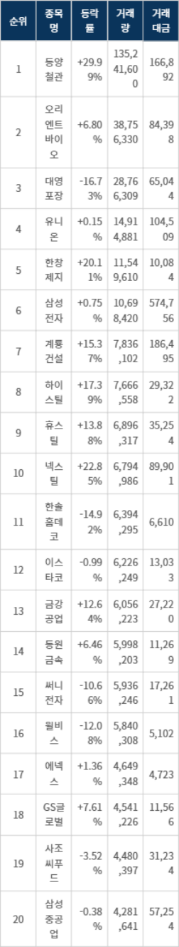 대영포장(014160)은 거래량 2천8백7십만주를 기록하며 3위에 오르고 있다. 현재 주가는 2,065원으로, 등락률은 -16.73%를 보인다. 유니온(000910)은 현재가 6,620원, 등락률은 +0.15%, 거래량은 1천4백9십만주이다. 한창제지(009460)는 11,549,610주의 거래량과 +20.11%의 상승률을 보이며 주목받고 있다. 삼성전자(005930)는 10,698,420주의 거래량을 기록하며 현재가 53,900원, 등락률은 +0.75%이다. 계룡건설(013580)과 하이스틸(071090), 휴스틸(005010), 넥스틸(092790)도 각각 거래량에서 두각을 나타내고 있다. 계룡건설은 +15.37%, 하이스틸은 +17.39%, 휴스틸은 +13.88%, 넥스틸은 +22.85%의 등락률을 기록 중이다.