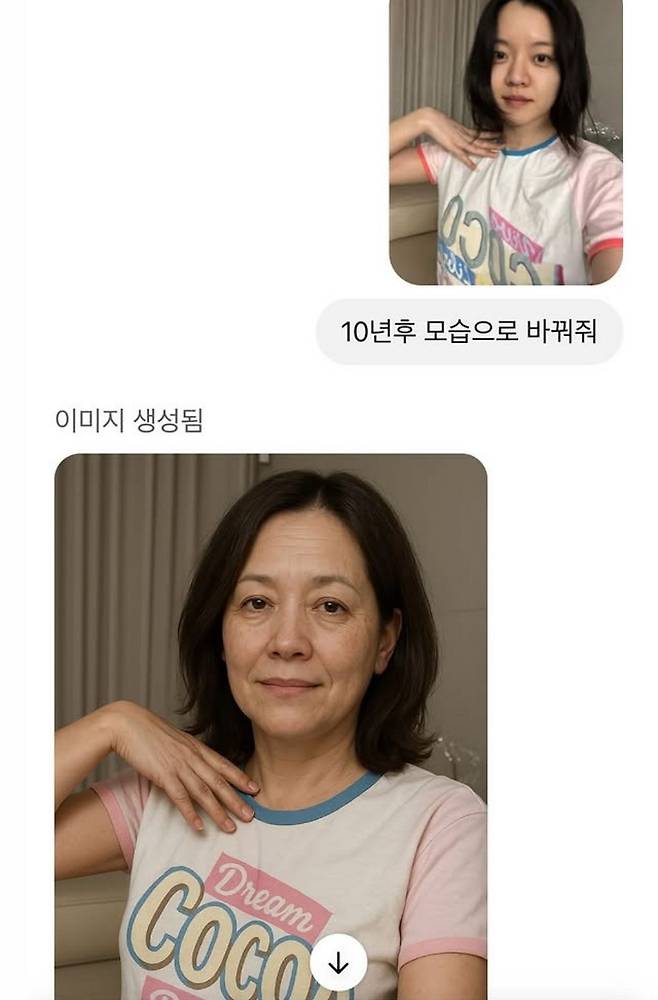 고아성은 AI에게 자신의 셀카와 함께 “10년 후 모습으로 바꿔줘”라고 요청했다. 그는 어깨에 손을 얹고 미소 짓고 있다. 단발머리를 한 고아성은 30대에도 여전히 학생 같은 청순한 매력을 뽐냈다.