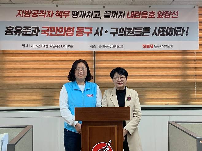 | ▲ 진보당 울산시당 이은주 동구지역위원장(오른쪽) 등 당원이 9일 동구청 프레스센터에서 내란 옹호 국힘 의원의 사죄를 요구하고 있다. |