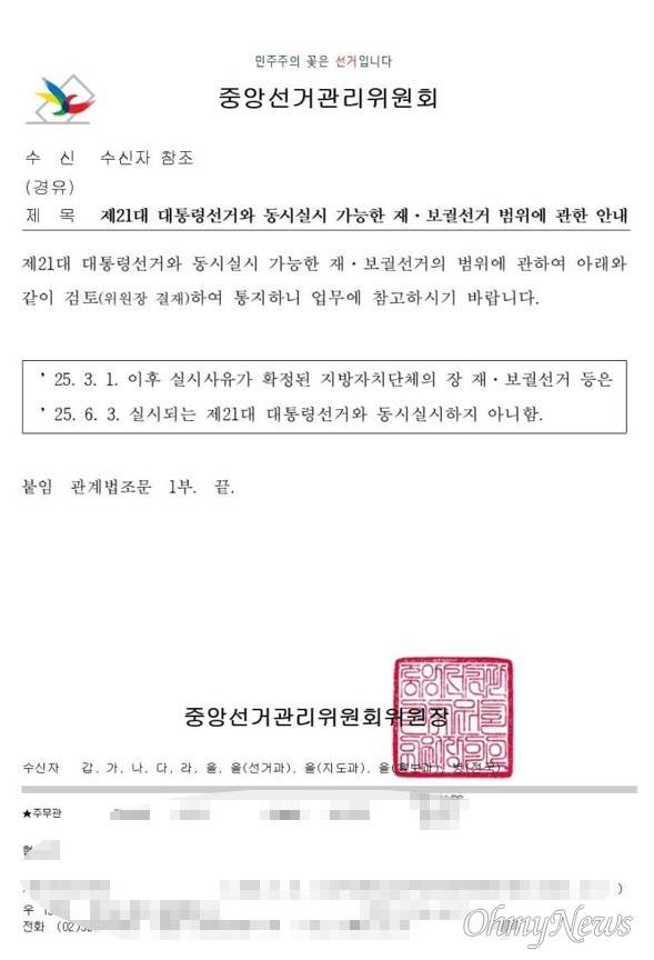 중앙선관위는 "3월 1일 이후 실시 사유가 확정된 지방자치단체장의 재보궐선거 등은 6월 3일 실시되는 제21대 대통령선거와 동시 실시하지 아니한다"라고 안내했다.