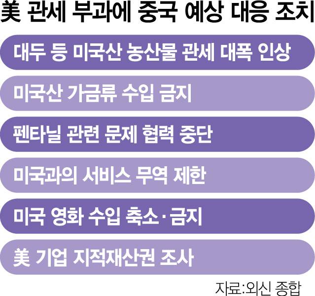 중국은 미국의 무차별 관세에 개별 산업을 타깃으로 삼은 보복 조치로 대응해 나간다는 방침이다.