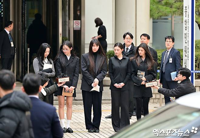 지난달 7일 진행된 가처분 신청 심문기일과 다른 점이 있다면, 바로 방청 여부다. 당시 재판을 방청하기 위해 수많은 팬들이 몰린 데 이어 뉴진스 멤버 5인도 검은 정장을 입고 직접 법정에 출석했다.