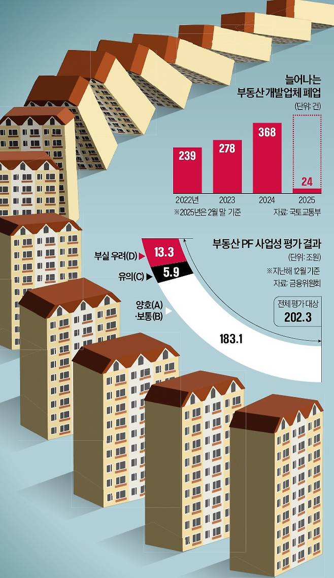 PF 시장 경색으로 시행사 폐업이 크게 늘고 있다. 국토교통부에 따르면 지난해 폐업한 부동산 개발업체는 368곳에 이른다. 시행사 폐업은 2022년 239곳, 2023년 278곳 등 매년 늘어나고 있다. 올해 1~2월에도 24곳의 디벨로퍼가 문을 닫았다. 업계에선 PF 위기가 불거진 2022년 레고랜드 사태 이후 자금난이 가장 심각하다는 반응이 나온다. 부동산개발협회 관계자는 “우량 사업장이 PF 대출 기준 미비로 자금난이 가중되는 가운데 이자 선취 같은 불합리한 관행은 여전하다”며 “자금력이 달리는 영세 시행사는 고사 직전”이라고 말했다.