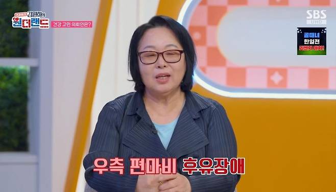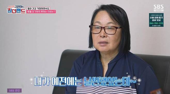 9일 방송된 SBS '김원희의 원더랜드'에서는 2006년 뇌출혈 진단을 받고, 우측 편마비 후유장애를 앓고 있는 62세 김미경 씨가 의로인으로 출연했다.