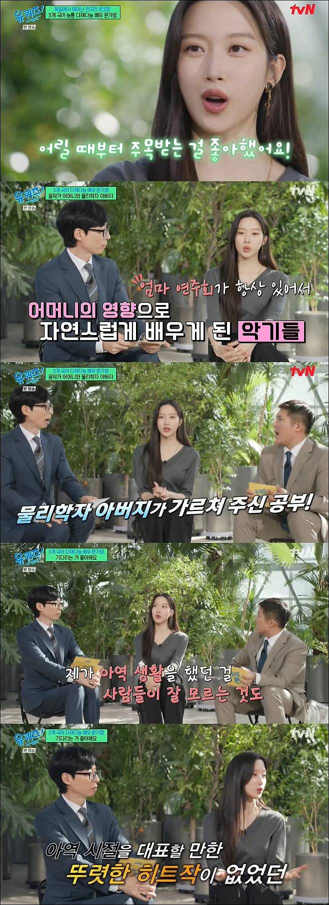 독일 유학생으로 만나 결혼까지 했다는 문가영의 부모님. 유재석은 "집안 얘기를 듣다 보니까 집안이 격조가 있는 거 같다"고 감탄했다. 음대생인 어머니의 영향으로 문가영도 자연스럽게 악기를 배우게 됐다고. 문가영은 "사실 엄마 영향으로 피아노를 편하게 치고 플루트, 바이올린도 열심히 연습하면 (할 수 있다)"이라고 밝혔다.