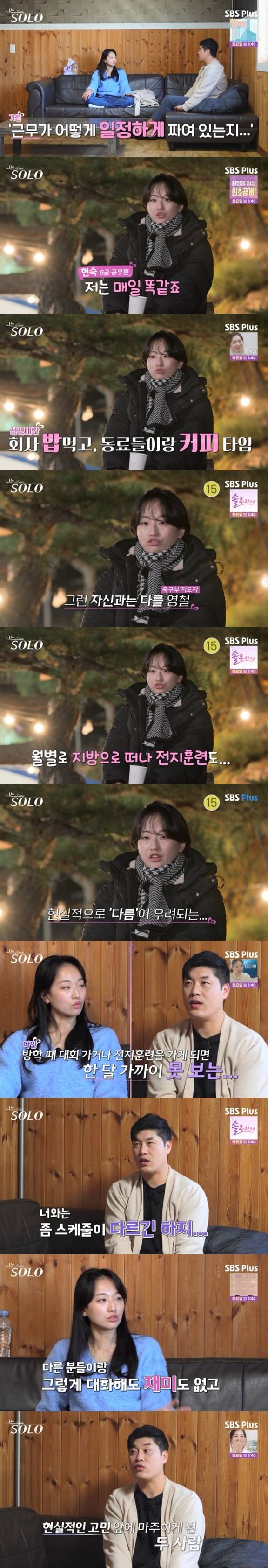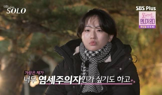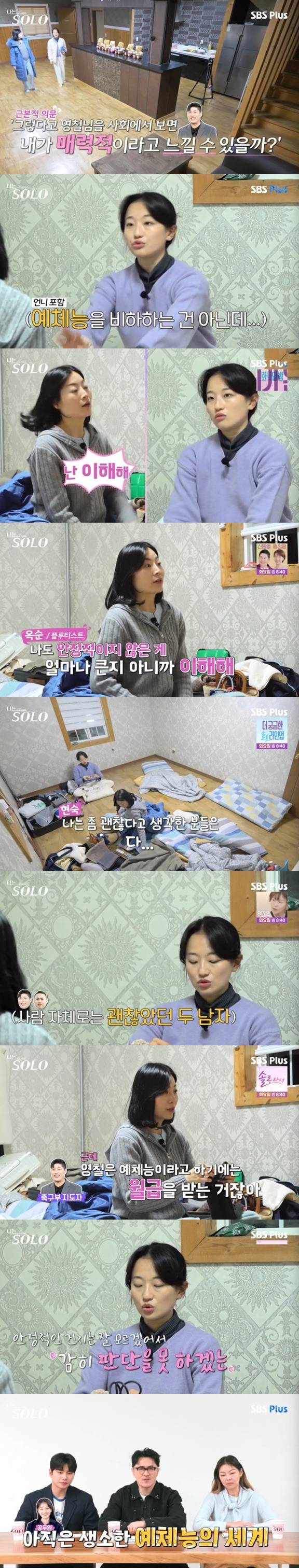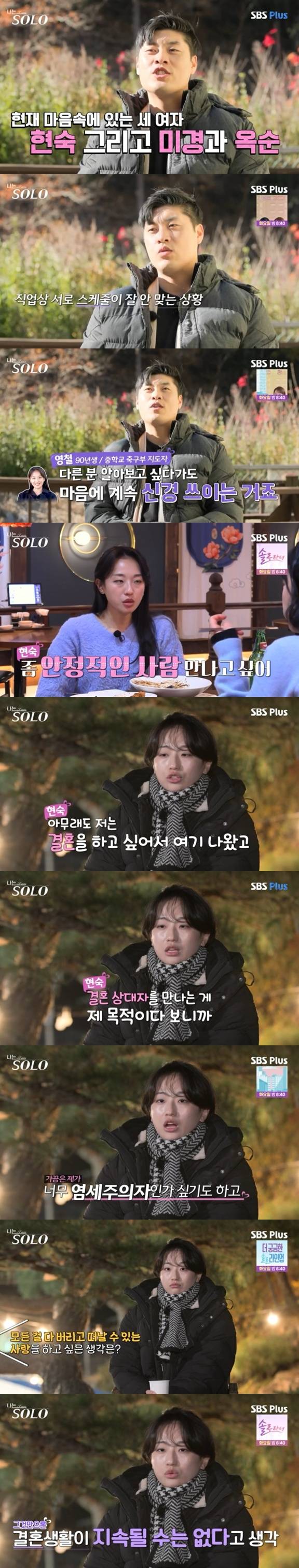 9일 방송한 ENA·SBS Plus 리얼 데이팅 프로그램 '나는 SOLO'에서 25기 현숙은 옥순에게 "영철님을 사회에서 보면 내가 매력적이라고 느낄 수 있을까"라고 털어놓았다.