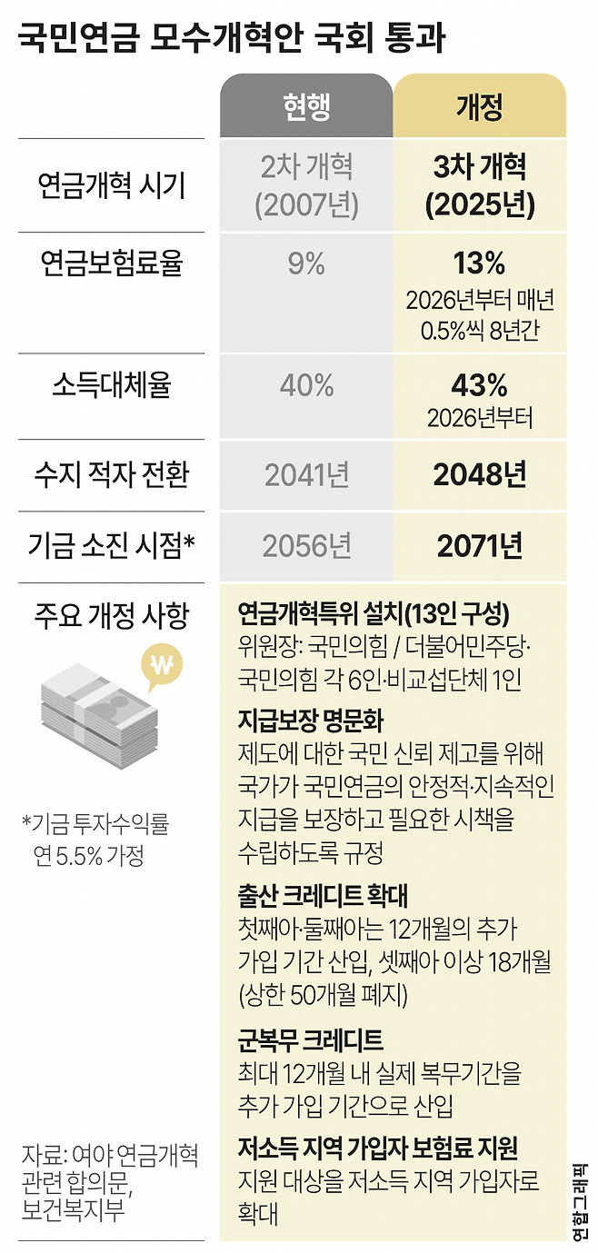 여기에는 약간의 오해가 있다. 소득대체율 인상은 현재 연금 수급자들에게 적용되지 않는다. 수년 내로 연급 납부 기한을 채우게 되는 중장년층 역시 내년부터 60세까지 내는 보험료에 대해서만 소득대체율 43%가 인정된다.