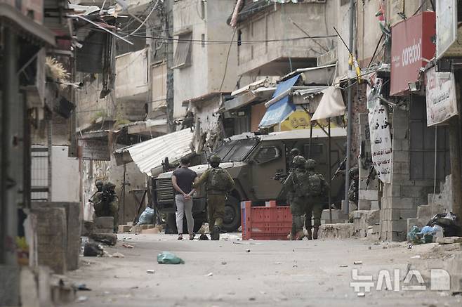 [발라타=AP/뉴시스] 9일(현지 시간) 요르단강 서안지구 발라타 난민수용소에서 군사 작전을 펼치는 이스라엘군인들이 한 팔레스타인 남성을 체포해 연행하고 있다. 2025.04.10.