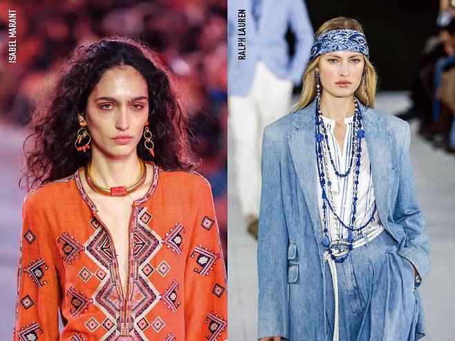 지난 시즌 끌로에의 컴백과 함께 조용히 존재감을 드러낸 보헤미안 시크가 이번 시즌 드디어 메가트렌드로 자리 잡을 예정이다. 섬세한 디테일, 하늘하늘한 소재 그리고 과감한 패턴 덕분에 초여름을 앞두고 더욱 반갑게 느껴진다. 하지만 스타일링이 생각보다 쉽지 않다는 게 문제다. 러플 디테일처럼 보헤미안 시크를 대표하는 요소가 자칫 촌스러워 보일 수 있기 때문. 이럴 땐 주얼리를 활용하는 게 가장 현명하다. 랄프로렌처럼 히피 무드의 롱 네크리스나 볼드한 이어링을 크로셰나 레이스 디테일의 옷과 매치해보자. 이자벨마랑의 룩처럼 페이즐리 패턴 드레스에 유색 스톤 주얼리를 더하면 한층 세련된 보헤미안 스타일을 완성할 수 있다.