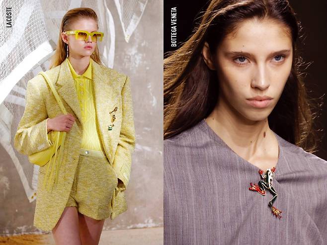 브로치는 고대 그리스와 로마 시대부터 이어져온 클래식한 아이템이다. 이미 다양한 소재와 디자인으로 소개되었지만, 최근에는 색다른 활용법이 돋보인다. 헤어나 가방에 포인트 액세서리로 달거나, 라코스테처럼 작은 브로치를 여러 개 믹스 매치하는 스타일링이 인기다. 보테가베네타는 살아 있는 듯 생생하게 표현된 개구리 브로치로 유쾌하면서도 감각적인 룩을 선보였다. 평범한 스타일이 지겨워졌다면, 한층 대담하고 재미있게 브로치를 활용해보자.