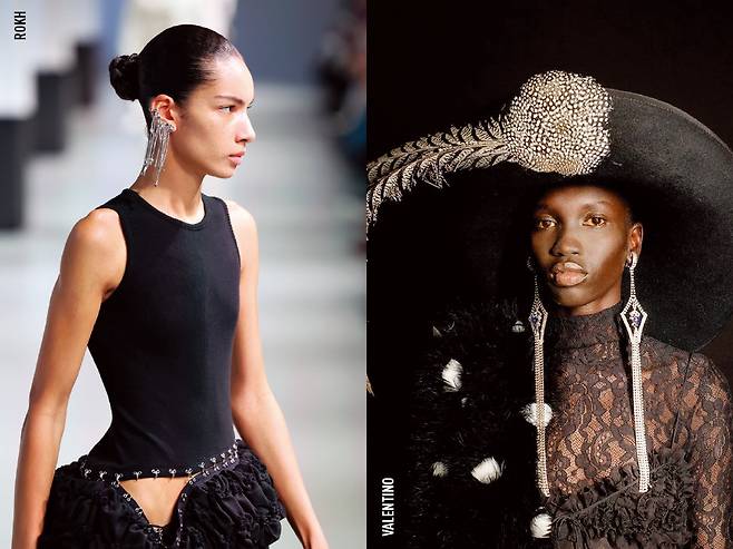자유롭게 흩날리며 낭만적인 무드를 자아내던 프린지 디테일이 이번 시즌 주얼리로 활약했다. 디자이너들은 가죽, 체인, 크리스털 등 다양한 소재의 프린지를 활용해 우아하면서도 세련된 주얼리를 소개하며 런웨이에 생동감을 더했다. 특히 프린지 장식을 더해 호화로운 주얼리 컬렉션을 선보인 발렌티노의 알레산드로 미켈레가 대표적인 예. 프린지 디테일을 부담 없이 즐기고 싶다면, 로크처럼 무채색 룩이나 군더더기 없는 간결한 실루엣의 아이템과 매치해보자.