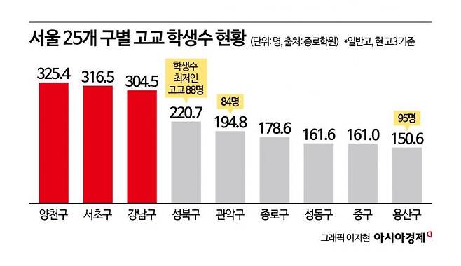 반면 관악구(12개교, 194.8명), 종로구(7개교, 178.6명), 성동구(5개교, 161.6명), 중구(3개교, 161.0명), 용산구(7개교, 150.6명) 등은 한 학년 당 학생 수가 100명대에 그쳤다.