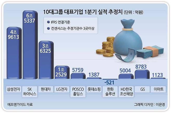 10일 헤럴드경제가 금융정보업체 에프앤가이드를 통해 재계 10대 그룹(농협 제외) 대표 기업(삼성전자·SK하이닉스·현대자동차·LG전자·롯데쇼핑·포스코홀딩스·한화솔루션·HD현대중공업·GS·이마트)의 1분기 실적 컨센서스(증권사 추정치 평균)를 집계한 결과, 10곳 중 4곳이 전년 동기 대비 영업이익이 하락할 것으로 예상되고, 1곳은 적자가 이어질 것으로 예상됐다.