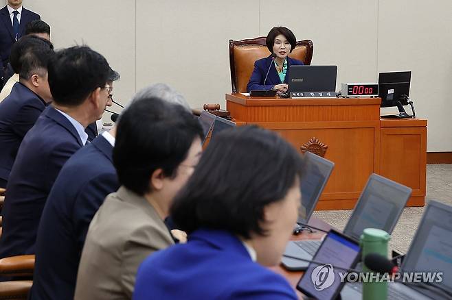 (서울=연합뉴스) 김주성 기자 = 10일 국회 기후위기특별위원회 전체회의에서 위원장으로 선임된 더불어민주당 한정애 의원이 인사말을 하고 있다. 2025.4.10