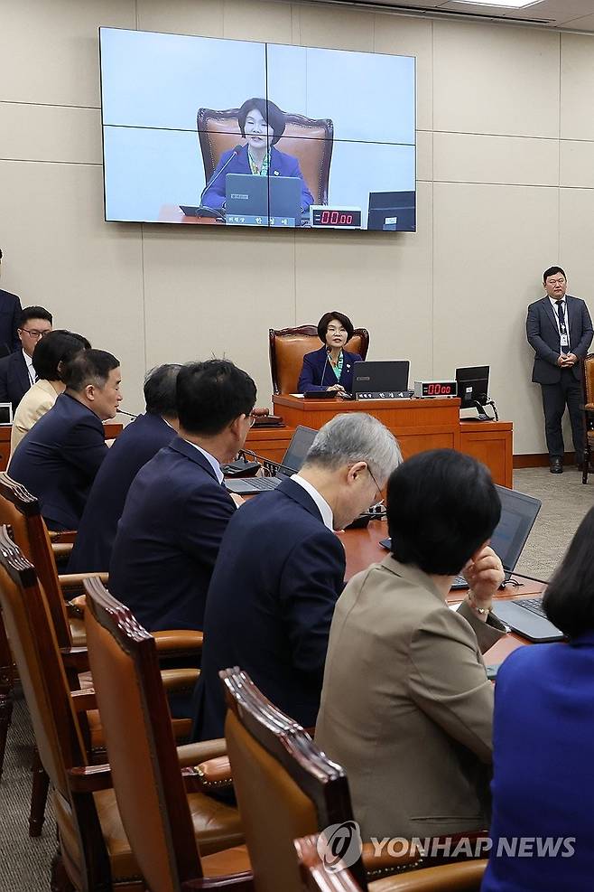 (서울=연합뉴스) 김주성 기자 = 10일 국회 기후위기특별위원회 전체회의에서 위원장으로 선임된 더불어민주당 한정애 의원이 인사말을 하고 있다. 2025.4.10