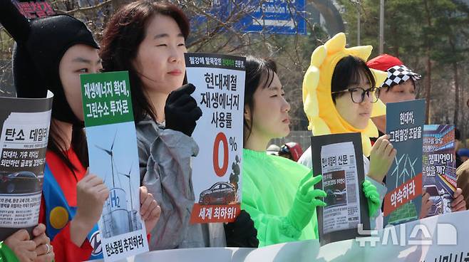 [고양=뉴시스] 전진환 기자 = 환경단체 회원들이 10일 오전 2025서울모빌리티쇼가 열린 경기도 고양시 킨텍스 인근에서 현대차의 재생에너지 및 그린철강 투자를 촉구하는 기자회견 중 피켓을 들고 있다. 2025.04.10. amin2@newsis.com