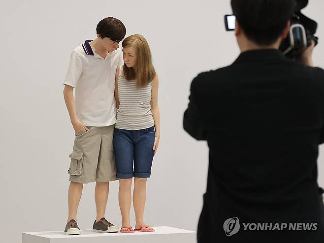 (서울=연합뉴스) 이재희 기자 = 10일 서울 종로구 국립현대미술관 서울관에서 열린 '론 뮤익' 전시에 '젊은 연인' 작품이 전시돼 있다. 이 전시는 오는 11일부터 7월 13일까지 열린다. 2025.4.10
