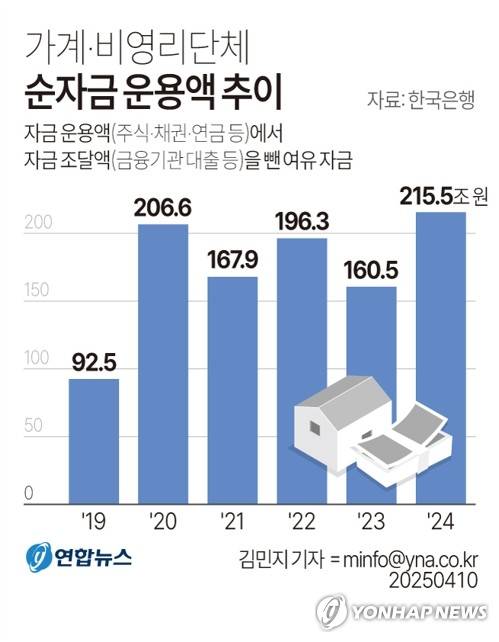 한국은행이 10일 공개한 '2024년 자금순환(잠정)' 통계에 따르면 가계(개인사업자 포함) 및 비영리단체의 지난해 순자금 운용액은 215조5천억원으로 집계됐다. 전년(160조5천억원)의 1.3 배로, 2009년 해당 통계 편제 이후 최대 기록이다.