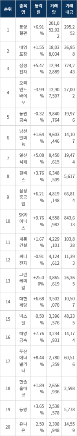 한편 거래량 상위 20위권 종목들은 계룡건설(013580) ▲1.67%, 써니전자(004770) ▼0.91%, 그린케미칼(083420) ▲25.00%, 대한제당(001790) ▲6.68%, 넥스틸(092790) ▼0.50%, 태양금속(004100) ▲7.76%, 두산에너빌리티(034020) ▲8.44%, 한솔홈데코(025750) ▲1.89%, 동방(004140) ▲3.65%, 유니온(000910) ▼2.50% 등의 성적을 기록하고 있다.