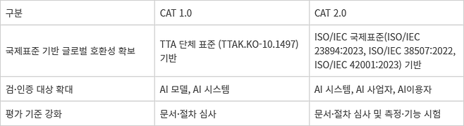 이번 CAT 고도화는 국내 AI 산업 실정을 반영해 기업 규모와 기술 위험도에 따라 심사·시험 기준을 차등 적용, 기업의 과도한 부담을 완화하고 실효적 신뢰성 확보를 지원했다. 또 글로벌 호환성 확보를 위해 ISO/IEC 23894(AI 위험관리), 42001(AI 경영시스템), 38507(AI 거버넌스) 등 국제표준을 기반으로 시험 기준을 분류하고 고도화해 글로벌 호환성을 확보했다.