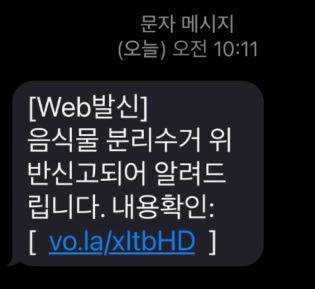 ‘폐기물·음식물 분리수거 위반’ 사칭 문자 기승…URL 클릭 시 금전 피해 우려