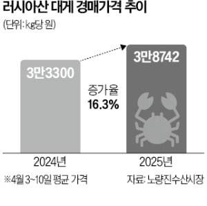 러시아산 대게값 상승세가 뚜렷하다. 중국 수입량이 늘어나면서 국내 도매가격이 1년 새 15% 넘게 올랐다. 러시아산 대게는 국내 유통 물량의 90%에 달한다.