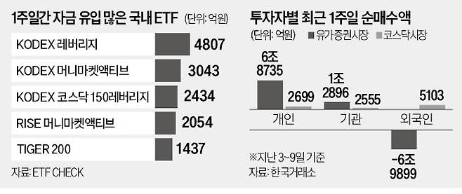 이날 ETF체크에 따르면 전날까지 최근 1주일간(지난 3~9일) 가장 많은 자금이 순유입된 국내 상장 ETF는 ‘KODEX 레버리지’였다. 4807억원의 자금이 몰렸다. 3위는 2434억원이 순유입된 ‘KODEX 코스닥150레버리지’였다. 각각 코스피200·코스닥150지수의 하루 수익률을 두 배로 추종하는 상품이다.