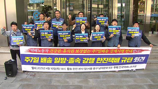 민주노총 서비스연맹 전국택배노동조합은 오늘(10일) 서울 중구 한진 본사 앞에서 기자회견을 열고 “한진 원청이 대리점, 노동조합과의 제대로 된 협의도 없이 일방, 졸속으로 주 7일 배송을 시행하려 하고 있다”고 밝혔습니다.