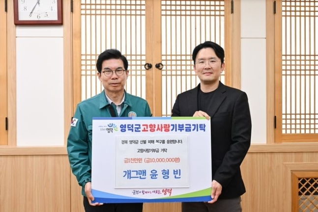 고향사랑기부제 민간플랫폼 위기브의 홍보대사로 활동하고 있는 개그맨 윤형빈은 산불 피해자들을 돕기 위해 지난 9일 영덕군을 방문해 1000만 원을 전달했다.
