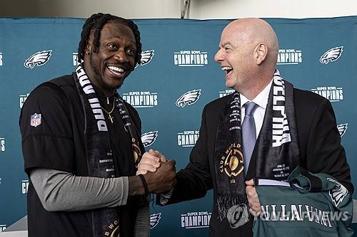FIFA President Gianni Infantino, right, talks with Philadelphia Eagles NFL football player A.J. Brown, left, at a welcoming event for the 2025 FIFA Club World Cup soccer tournament, Thursday, April 10, 2025, in Philadelphia. (AP Photo/Chris Szagola)