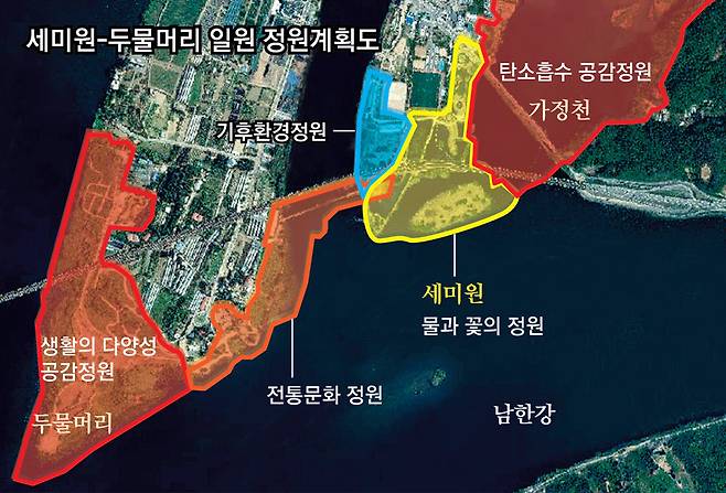 세미원의 면적은 12만7000여 m²로 축구장(7130m² 18개 크기와 맞먹는다. 하지만 국가정원에 필요한 면적 기준 30만 m²에는 못 미친다. 이 규격에 맞추기 위해 두물머리 생태학습장 조성지와 가정천 일원을 편입해 정원 구역을 60만 m²로 확대할 예정이다. 지난해 5월 전국 최대 규모의 전통 배다리를 복구해 세미원과 두물머리 구간을 연결한 것도 이런 이유에서다.