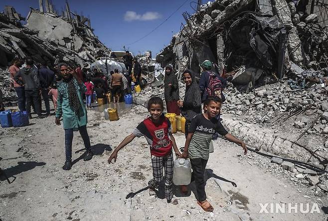 10일(현지 시간) 가자지구 북부 자발리아 난민캠프에서 팔레스타인 난민 어린이들이 급수 트럭에서 물을 받아 돌아가고 있다.