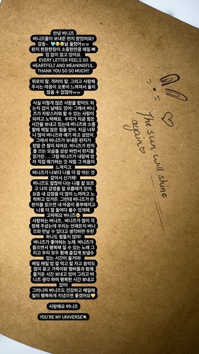 버니즈도 알잖아 나는 나를 잘 모르고 나의 감정을 잘 모를 때가 있어. 요즘 내 감정을 더 많이 느끼려고 노력하고 있거든. 그런데 버니즈가 쓴 편지를 읽으면 내 마음이 풍부해지고 나를 더 잘 들여다볼 수 있게 돼. 고마워요 버니즈. 사랑하는 버니즈. 버니즈가 많이 걱정해 주셨는데 우리는 언제든지 버니즈와 만날 수 있다고 생각하면 우린 하나도 힘들지 않아!