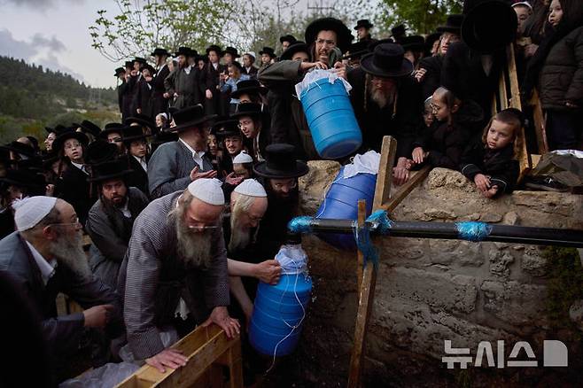 [예루살렘=AP/뉴시스] 10일(현지 시간) 예루살렘 외곽 산속 샘터에서 초정통파 유대교 남성들이 '유월절'(Passover)을 앞두고 누룩을 넣지 않은 전통 빵 '마쪼'(matzoh·무교병)를 만들 물을 긷고 있다. '유월절'은 신약성경에서 예수 그리스도가 십자가에 못 박히기 전날이자 제자들과 마지막 만찬을 한 날로, 레오나르도 다빈치의 ‘최후의 만찬’ 작품의 모티브가 되기도 했다. 올해 유월절은 12일 일몰부터 19일 일몰까지 이어진다. 2025.04.11.