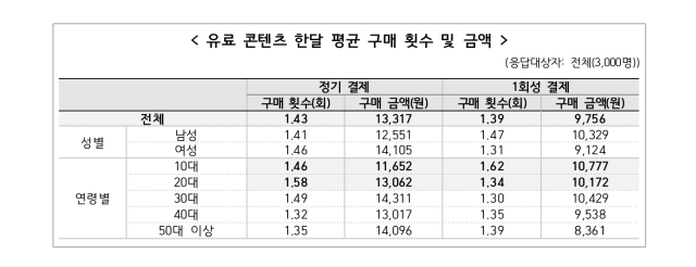 유료 콘텐츠 구매의 경우, 우리나라 국민은 월 평균 1.43회 정기 결제를 하며 1만3317원을 지출한다. 1회성 결제에는 월평균 1.39회, 9756원을 소비했다. 유료 콘텐츠 구매 경험이 있는 최종이용자 중 28.3%가 환불 신청을 해봤으며, 환불 소요 기간에 있어서는 ‘최대 1주 이내’가 50%로 가장 높았고, ‘최대 2주 이내’가 34.4%로 그 뒤를 이었다.