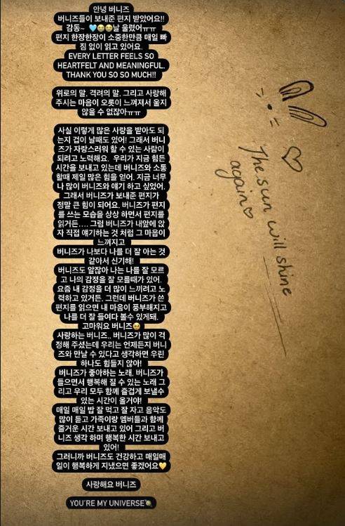또한 "버니즈가 나보다 나를 더 잘 아는 것 같아 신기하다. 나는 나를 잘 모르고 나의 감정을 잘 모를 때가 있다. 요즘 내 감정을 더 많이 느끼려고 노력하고 있다. 그런데 버니즈가 쓴 편지를 읽으면 마음이 풍부해지고 나를 더 잘 들여다볼 수 있게 된다"며 "고맙다"고 말했다.