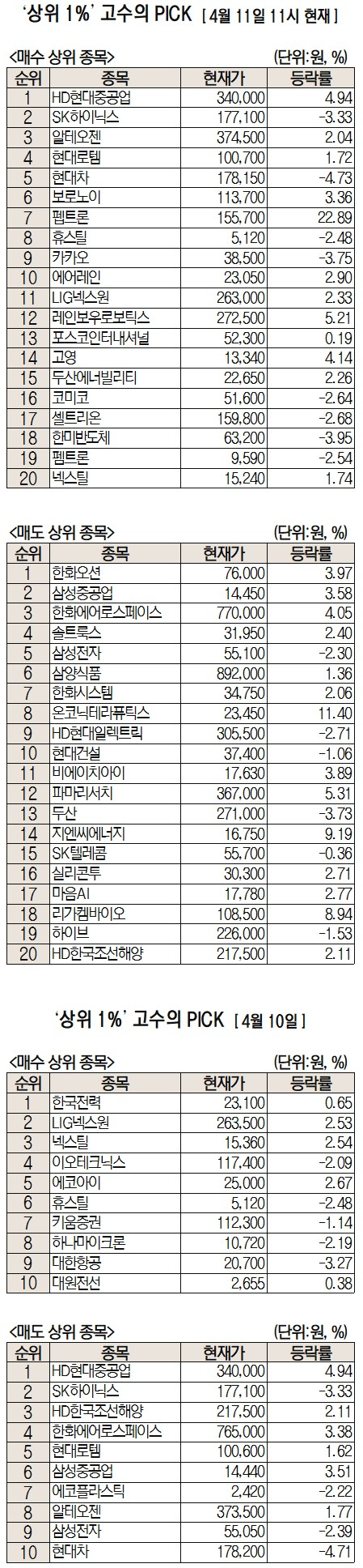 이날 미래에셋증권에 따르면 미래에셋증권 주식 거래 고객 중 최근 1개월간 투자수익률 상위 1%에 해당하는 ‘주식 초고수’들이 오전 11시까지 가장 많이 사들인 종목은 HD현대중공업이다.