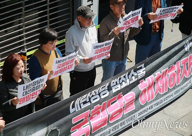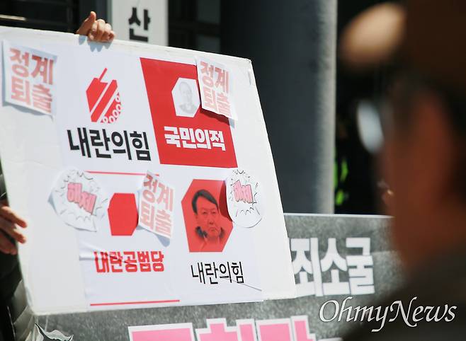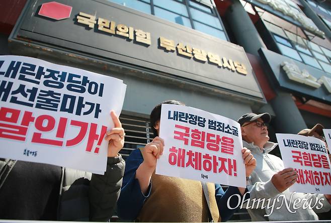 | ▲ [오마이포토] "내란정당, 국힘당을 해체하라" '윤석열 탄핵 운동'을 펼쳐온 부산촛불행동이 11일 국민의힘 부산시당사 앞을 찾아 규탄 기자회견을 열고 있다. |