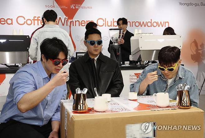 (부산=연합뉴스) 강선배 기자 = 11일 부산 영도구 끄티 봉래 2층 부산커피 R&D랩에서 열린 '코리아 커피 위너스클럽 스로우다운 2025'대회에서 엘리트 바리스타 심사위원들이 참가선수의 에스프레소를 시음하고 있다. 2025.4.11