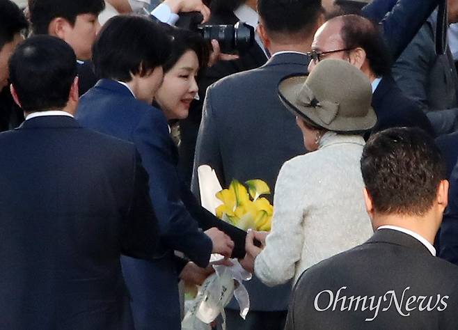 | ▲ 꽃다발 받는 김건희 대통령직에서 파면된 윤석열 전 대통령의 부인인 김건희 씨가 11일 오후 서울 용산구 대통령관저를 떠나 윤석열 전 대통령과 함께 서초구 자택으로 돌아오며 꽃다발을 받고 있다. |
