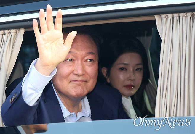| ▲ 윤석열 전 대통령이 헌법재판소 파면 선고 7일 후인 11일 오후 서울 서초동 사저로 가기 위해 용산구 한남동 대통령 관저를 떠나며 지지자들을 향해 손을 흔들고 있다. 승용차 옆자리에 부인 김건희씨가 앉아 있다. |