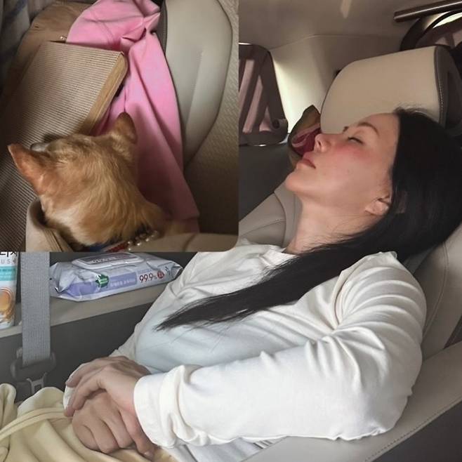 공개된 사진 속 엄정화는 드라마 촬영 중 쉬는 시간이 생긴 듯 편안한 복장으로 갈아입은 뒤 차에서 잠깐이지만 잠을 청하고 있다. 그 옆에 자리하고 있는 반려견 '슈퍼'도 늘어져 있는 모습이라 눈길을 끈다.