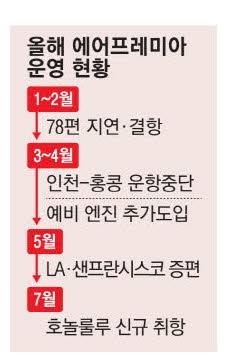 에어프레미아는 주로 미주행 장거리 노선을 운영 중인 하이브리드 항공사다. 대형항공사보다 저렴한 가격이 장점이지만 잦은 지연과 결항으로 소비자들의 원성을 듣고 있다. 지난 1~2월에만 78개 항공편의 운항 일정이 지연·결항됐다. 이 같은 상황에도 에어프레미아는 노선 확장에 열을 올리고 있다. 7월부터 주 4회 미국 하와이 호놀룰루 노선 운항을 확정해 항공권을 판매 중이고, 연내 미국 시애틀 취항도 추진 중이다.
