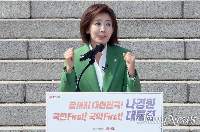 | ▲ 나경원, 대선 출마 "이재명 꺾겠다" 나경원 국민의힘 의원이 11일 오후 서울 여의도 국회 본청 앞 계단에서 "위험한 이재명 후보를 꺾고 대한민국을 구할 유일한 필승 후보로 승리의 역사를 만들겠다"며 대선 출마를 선언하고 있다. |