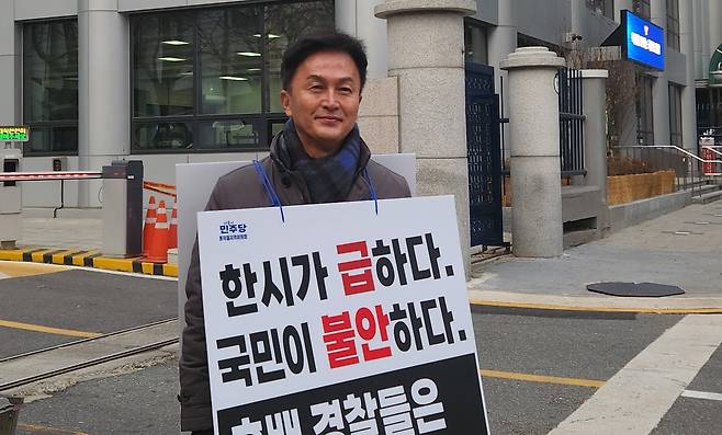 | ▲ 류삼영 전 총경이 2024년 12월 13일 경찰청 국가수사본부 앞에서 국회의장이 파견 경찰을 지휘하도록 해 줄 것을 요구하는 1인 시위를 하고 있다. |