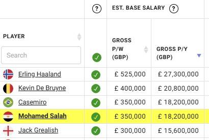 스포츠 경제 사이트 '캐폴로지(Capology)'에 따르면 살라는 현재 받는 주급은 프리미어리그에서 4번째로 높은 급여라고 한다. 리그 최고 주급을 받는 10명의 선수 중 리버풀 선수는 살라가 유일하다.