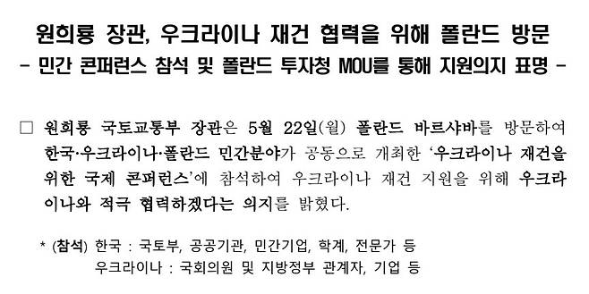 그러자 원 전 장관은 같은 날 페이스북을 통해 "당시 국토부는 기업대표단을 구성한 적이 없다"면서 "삼부토건이 참석했다는 우크라이나 글로벌 재건포럼은 국토부와 무관한 민간 주도의 콘퍼런스"라고 선을 그었습니다.