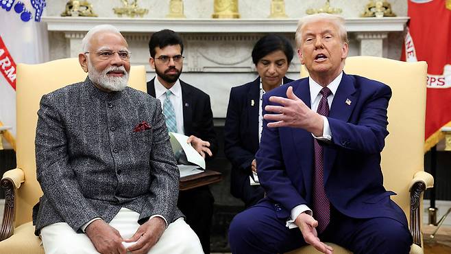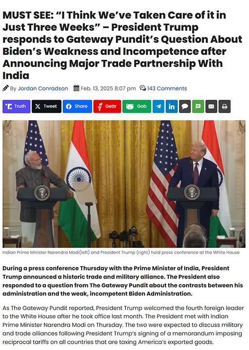 미국-인도 정상회담 기자회견 (지난 2월 13일) 기자2 : (모디 총리에게) 저는 궁금한 것이 있습니다. 지난 4년간 바이든의 무능함과 나약함과는 대조했을 때, 트럼프 대통령이 이 나라를 이끌고 계시기에, 힘을 통한 평화가 있을 것이라고 확신하십니까? 미국과 더 성공적인 관계를 맺을 수 있다고 보시나요? 트럼프 대통령 : (크게 웃으며) 모디 총리께 질문했지만 제가 답하겠습니다. 기자 발언에 동의합니다. (웃음) 그래요 심각한 무능함이었죠.
